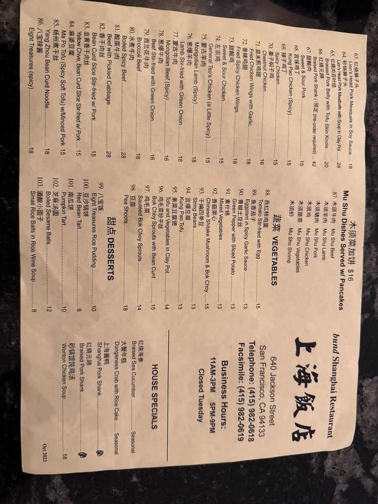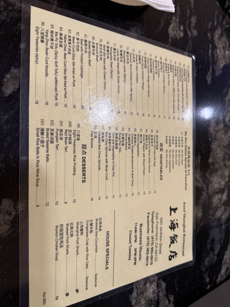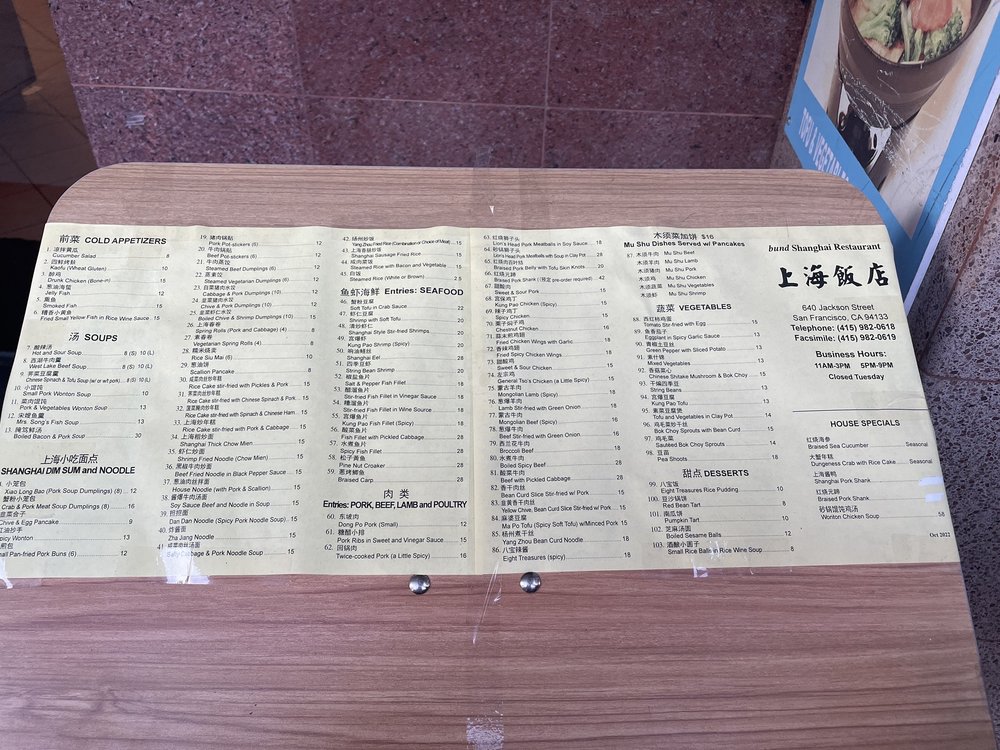 Introducing the menu at Bund Shanghai, you'll find an array of authentic Shanghainese dishes ranging from cold appetizers like Cucumber Salad and Fried Small Yellow Fish, to soul-warming soups like Hot and Sour Soup and Pork and Vegetables Wonton Soup. Their Shanghai Regional Cuisine includes favorites like Xiao Long Bao, Spicy Wonton, and Steamed Rice with Bacon and Vegetables. The reviews speak volumes, with customers praising the authenticity and quality of the food. From dan dan noodles to stir-fried shrimps, every dish is a delight for the palate. The warm and welcoming ambiance, paired with exceptional service, leaves a lasting impression. Bund Shanghai is a must-visit for a taste of traditional Shanghainese flavors in the heart of San Francisco's Chinatown.
