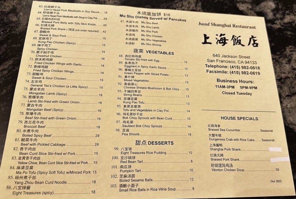Bund Shanghai Menu (Update 2025)